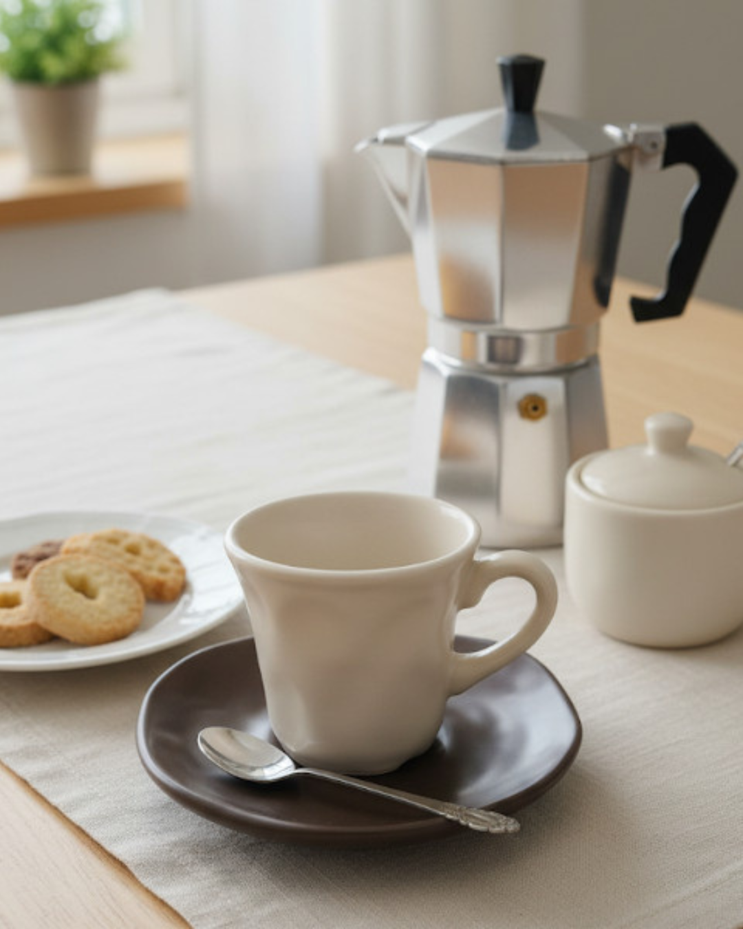 Design nordico caldo – Finitura opaca artigianale nei toni marrone e crema.
