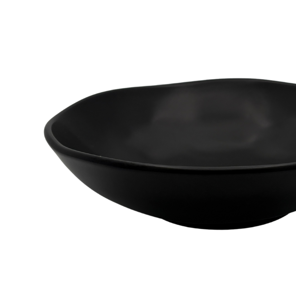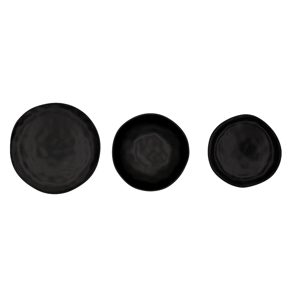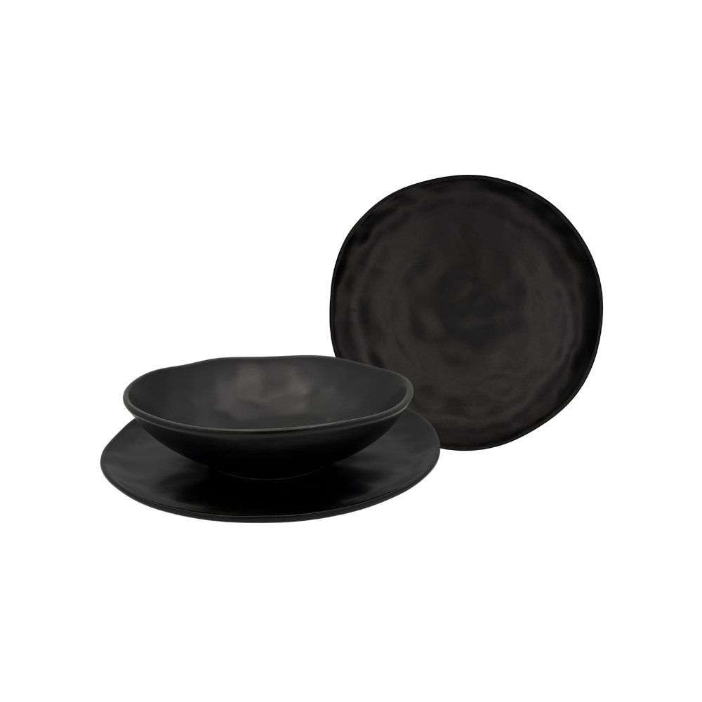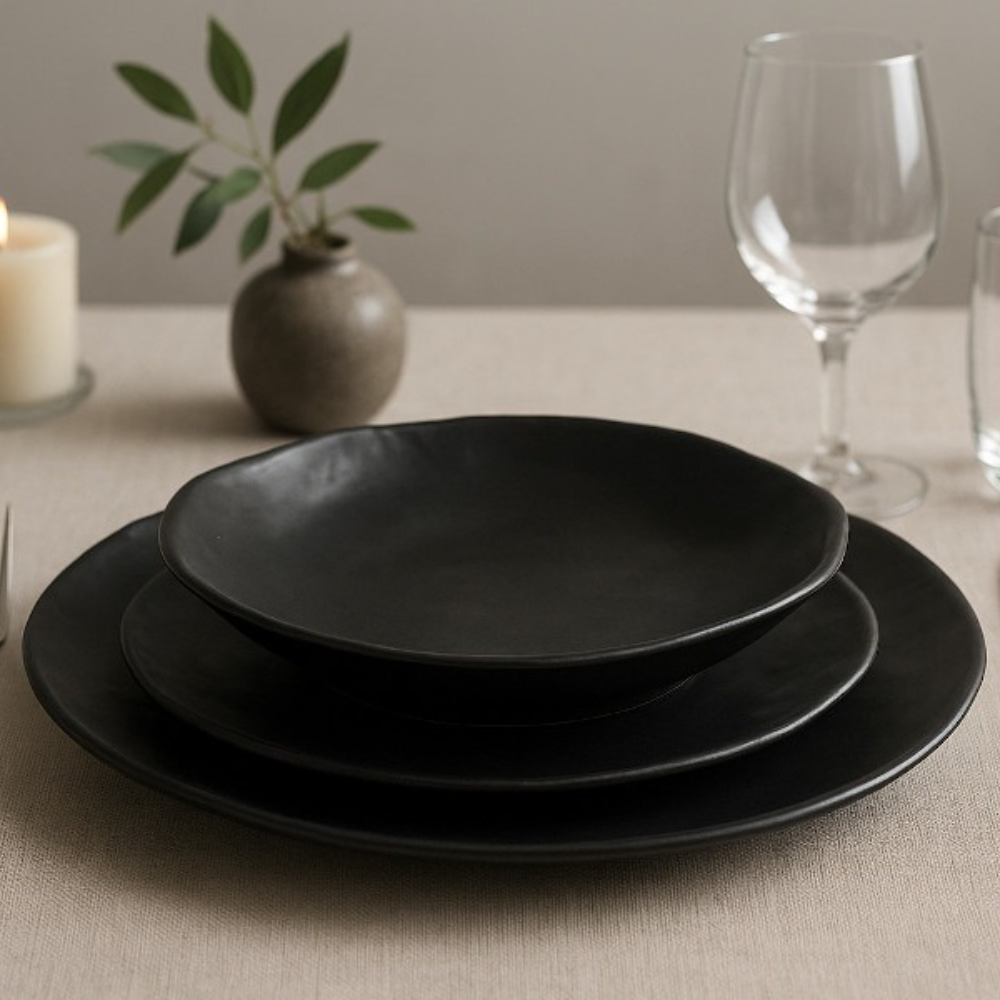 Design nordico minimalista – Linee irregolari effetto artigianale e finitura nera opaca per una tavola elegante e moderna.