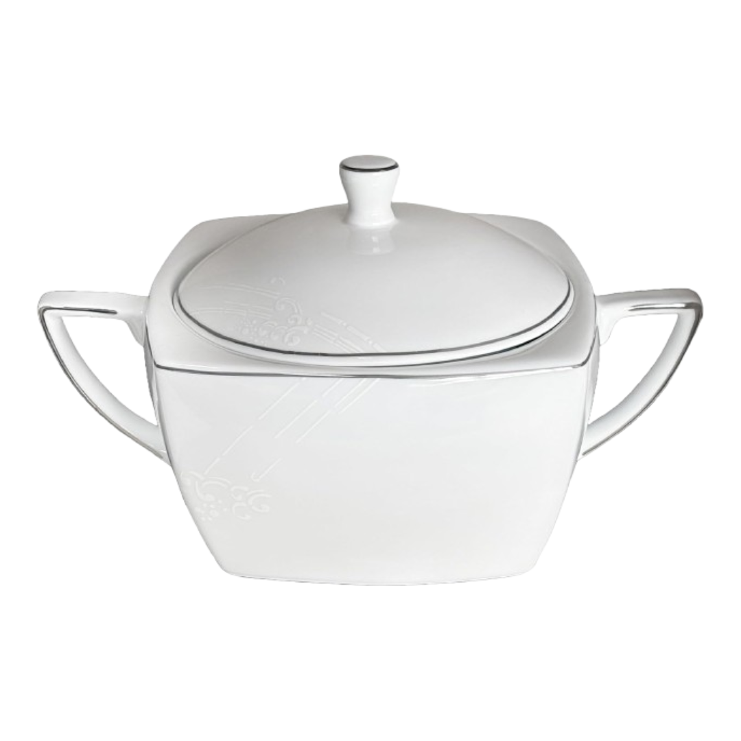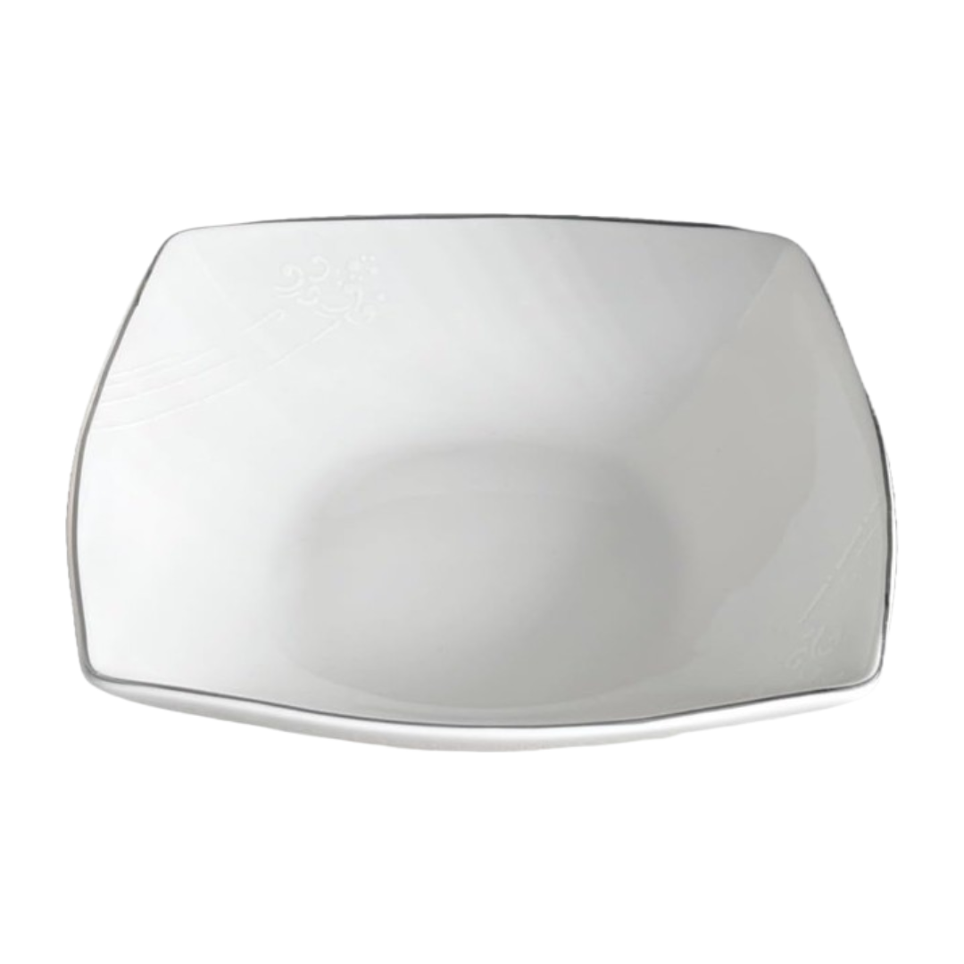 Materiale: Porcellana bianca con dettagli in rilievo bianco e bordi in decorati in un filo platino