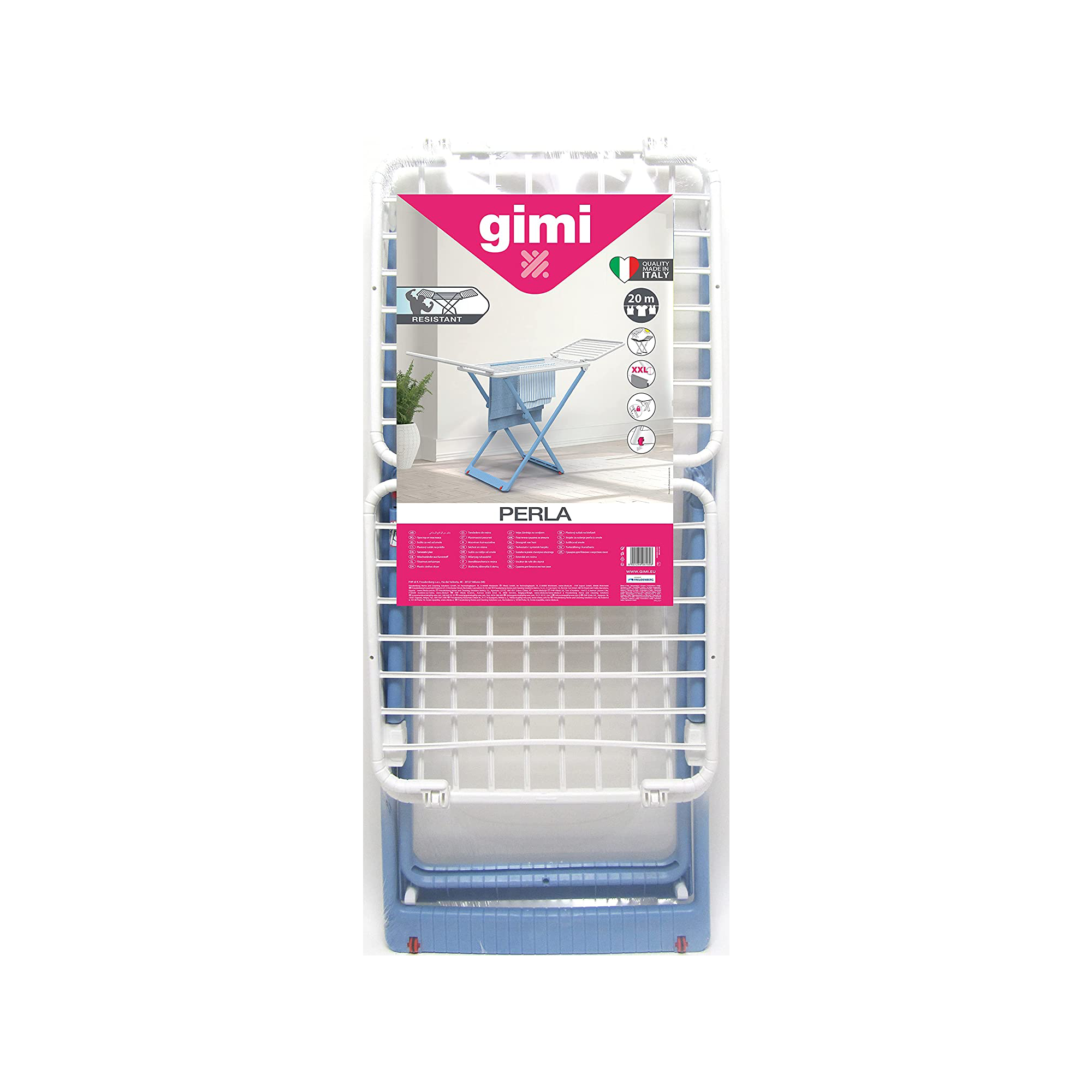 StendibiancheriaPerla, lo stendibiancheria da pavimento in resina di Gimi, è un prodotto di eccezionale durata, progettato specificamente per le località costiere. Questo stendibiancheria si distingue per le sue gambe a cavalletto e offre un generoso spazio di stenditura di 20 metri. La sua struttura ultra-resistente è progettata per resistere a flessioni e torsioni, garantendo così una lunga durata. I fili spessi limitano le pieghe sui capi, riducendo il tempo di stiratura e mantenendo i tuoi capi in ottime condizioni. Perla è dotato di un snodo anti-chiusura accidentale con un pulsante, che garantisce un uso sicuro. Le sue ruote facilitano lo spostamento, rendendolo un'opzione ideale per l'uso all'aperto. Realizzato al 100% in resina, Perla utilizza la Nytrogen Technology per i suoi fili anti-piega, con bracci in resina che sono anti-torsione e anti-flessione. Questa tecnologia innovativa garantisce la massima resistenza e durata. Quando aperto, Perla misura 190x54,5x90 cm, offrendo un ampio spazio di stenditura di 20 metri. Questo stendibiancheria è orgogliosamente prodotto in Italia, garantendo la massima qualità e design.
